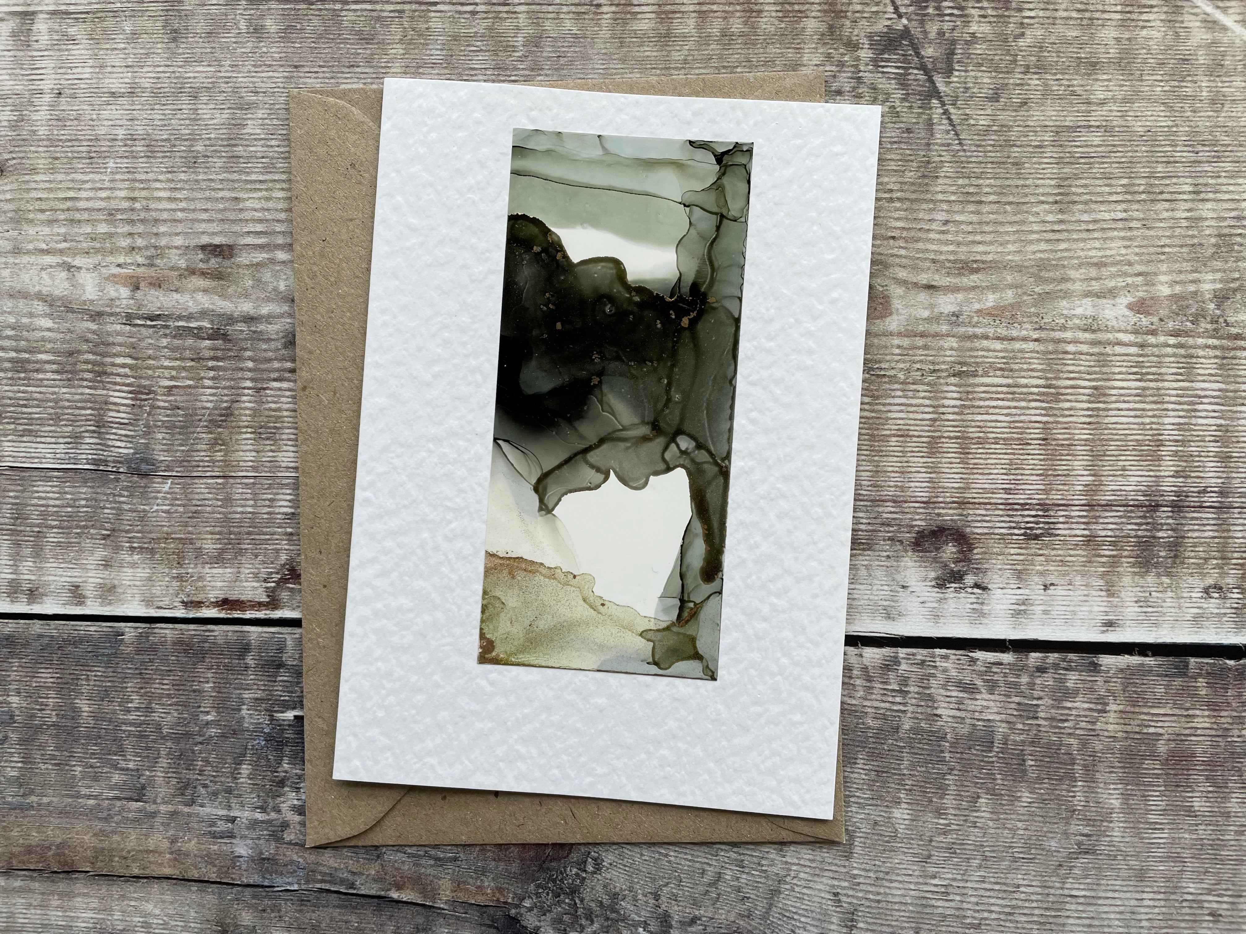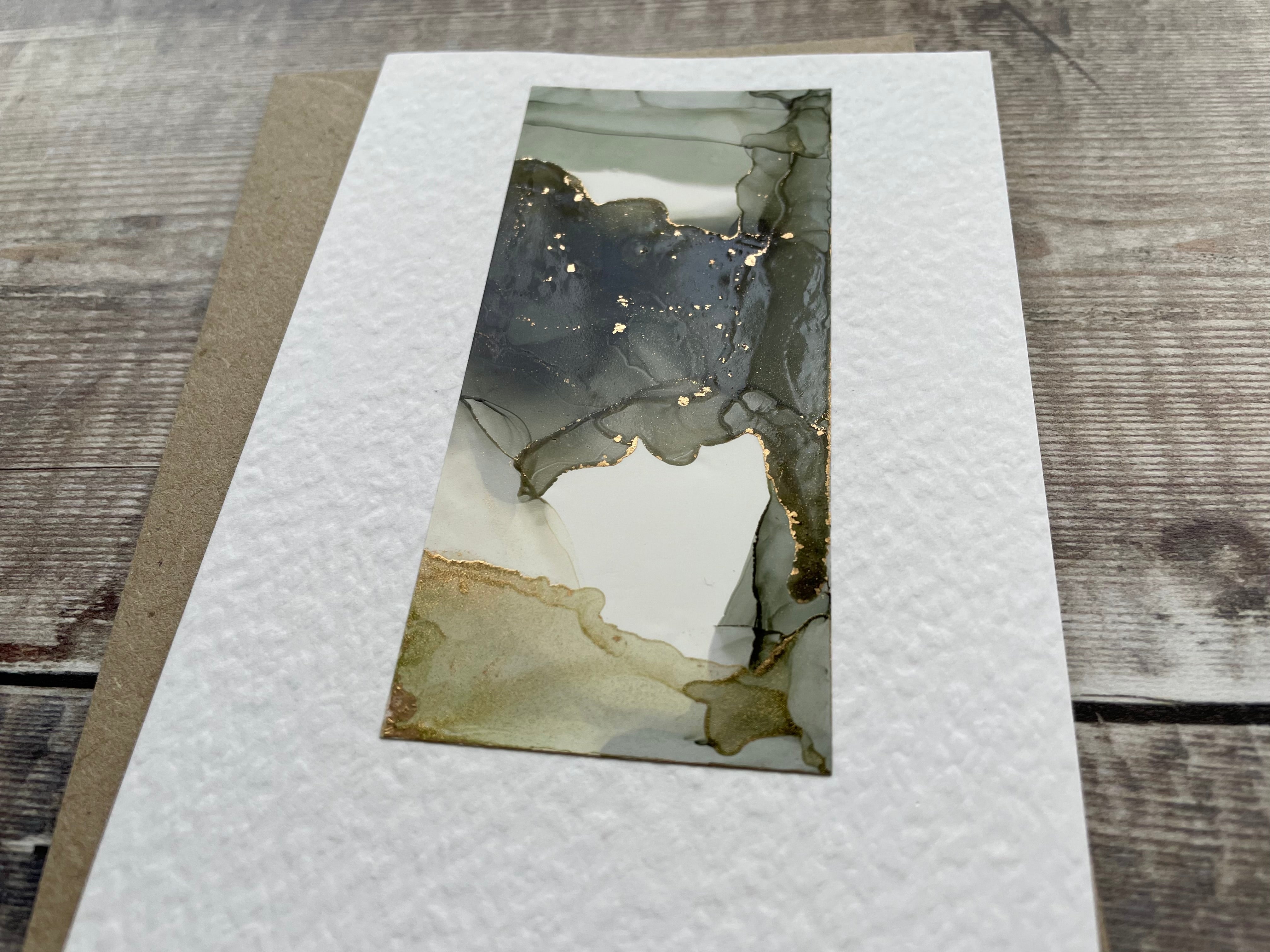 This A6 greeting card features one of my original 'alcohol ink' paintings with golden shimmer .