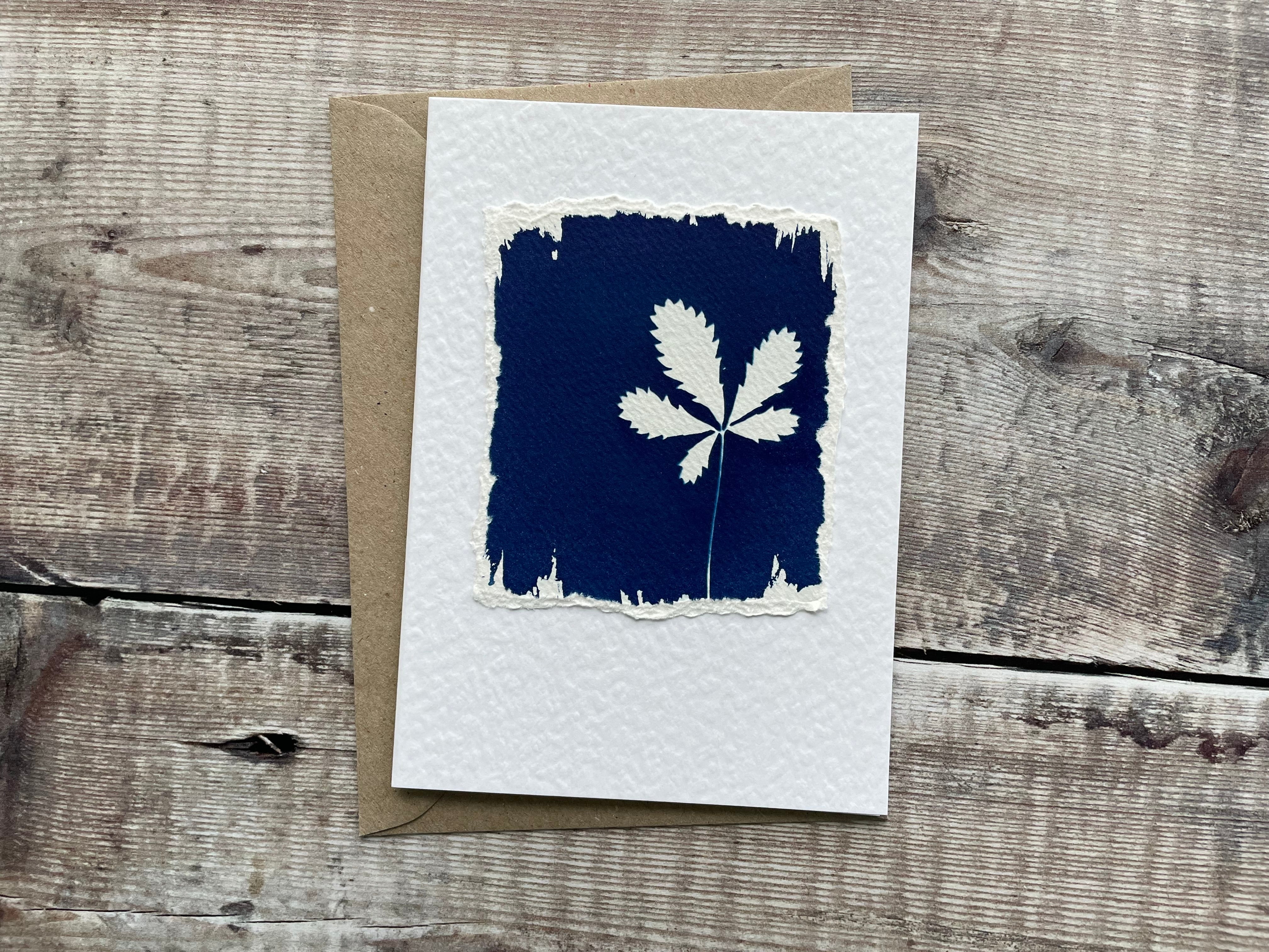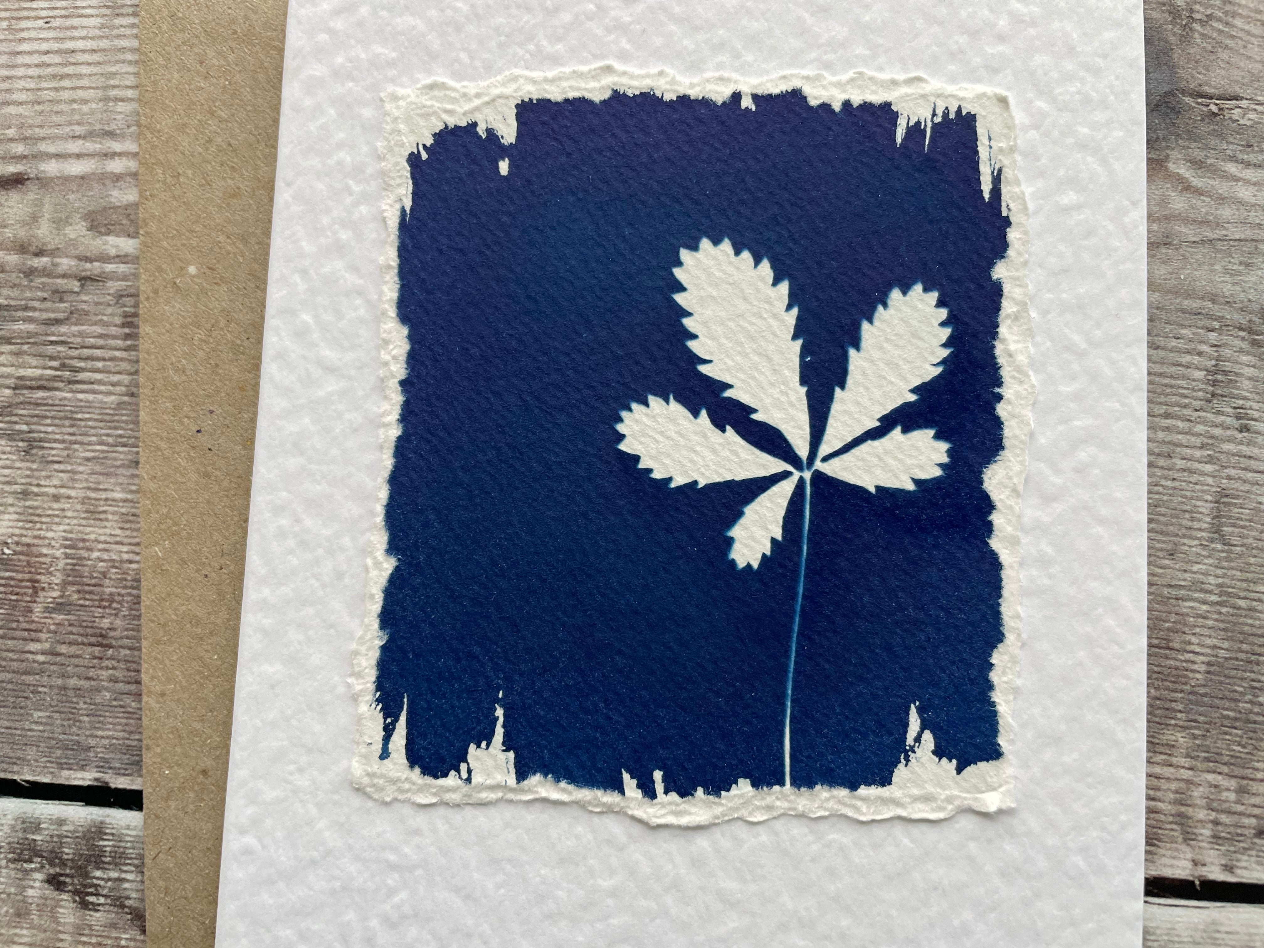 This A6 greeting card features an original cyanotype 'sun' print and is part of a series of prints I made with botanicals from the Kent countryside which I collected and dried.