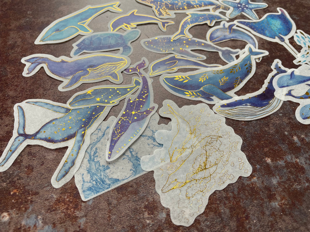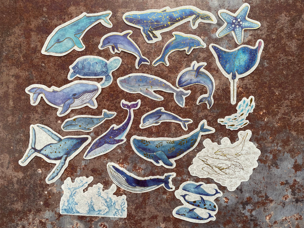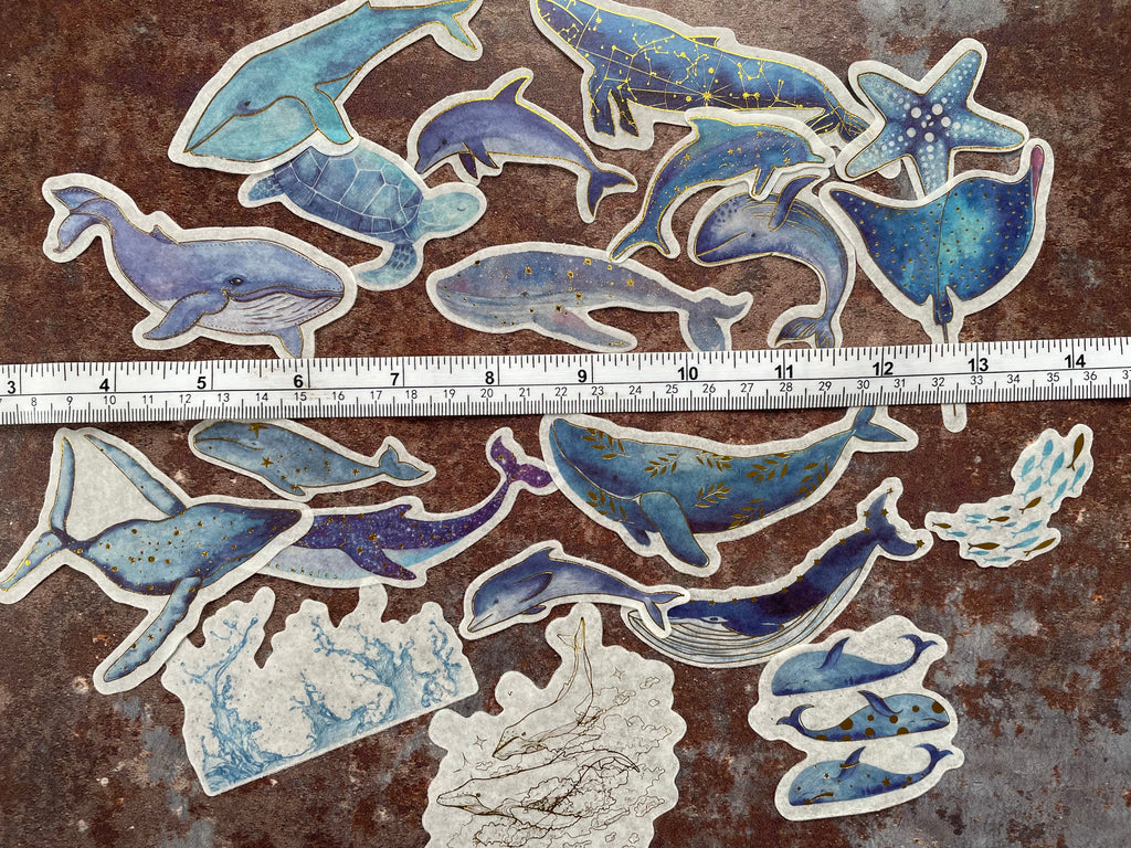 Celebrate the beauty of the ocean with this 'Gilded Whales & Dolphins' sticker set. Made from semi-translucent washi paper, each sticker captures majestic sea creatures accented with shimmering gold foil details. Perfect for adding beautiful focal points to your scrapbook pages, not just for beach lovers!