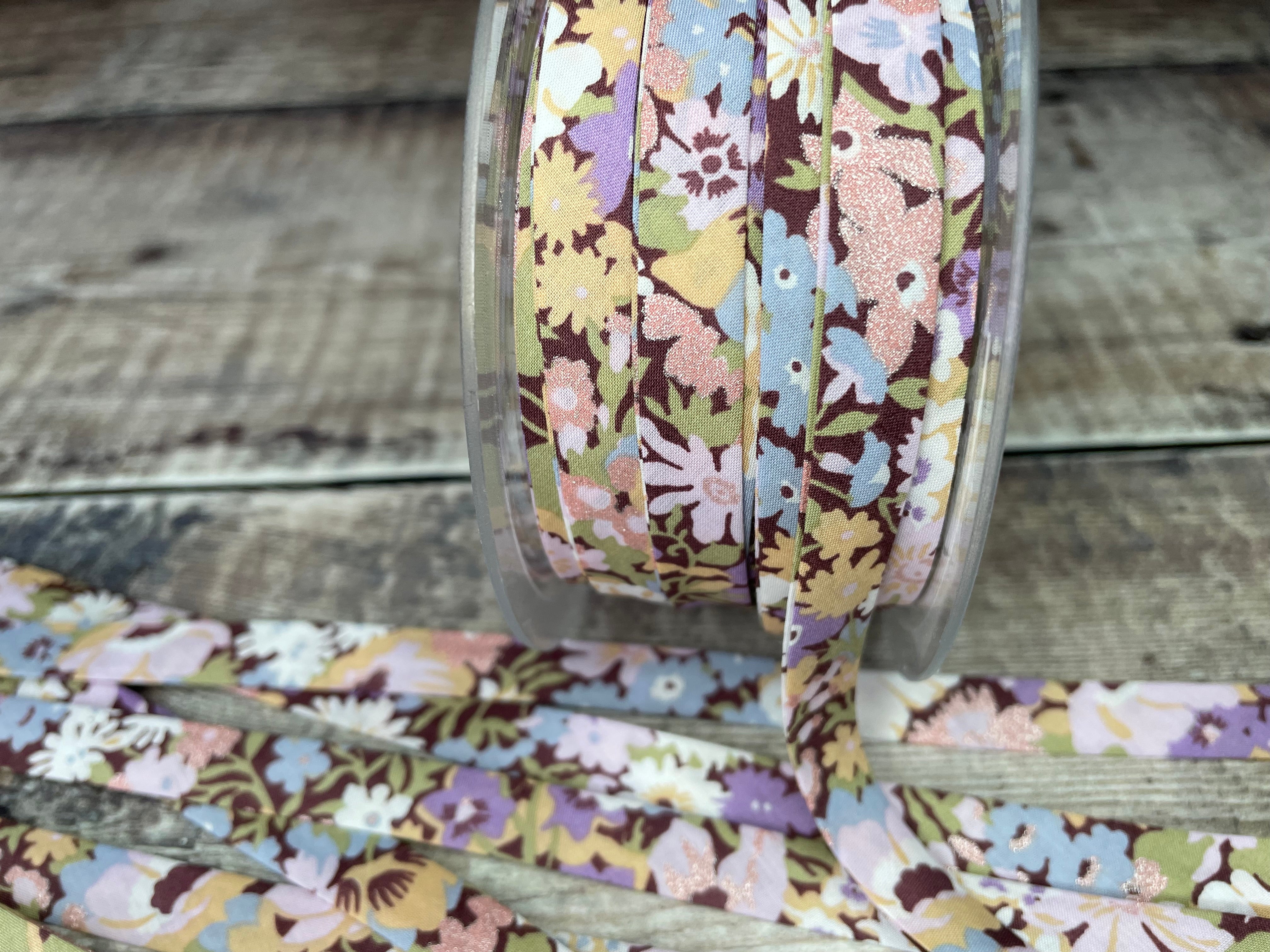 This 10mm wide, double fold Liberty Art Fabric bias binding is a classic print from the Thorpe series, featuring a summery mix of pinks, cream, green and light blue.