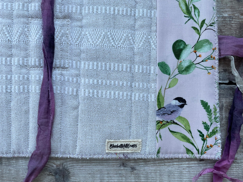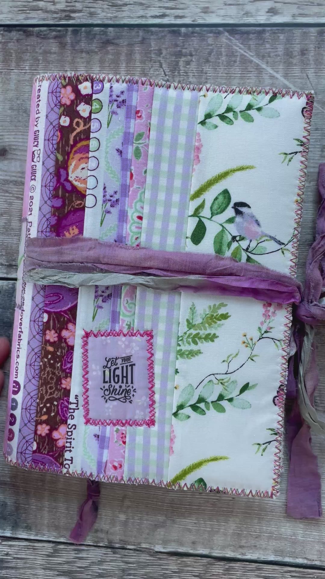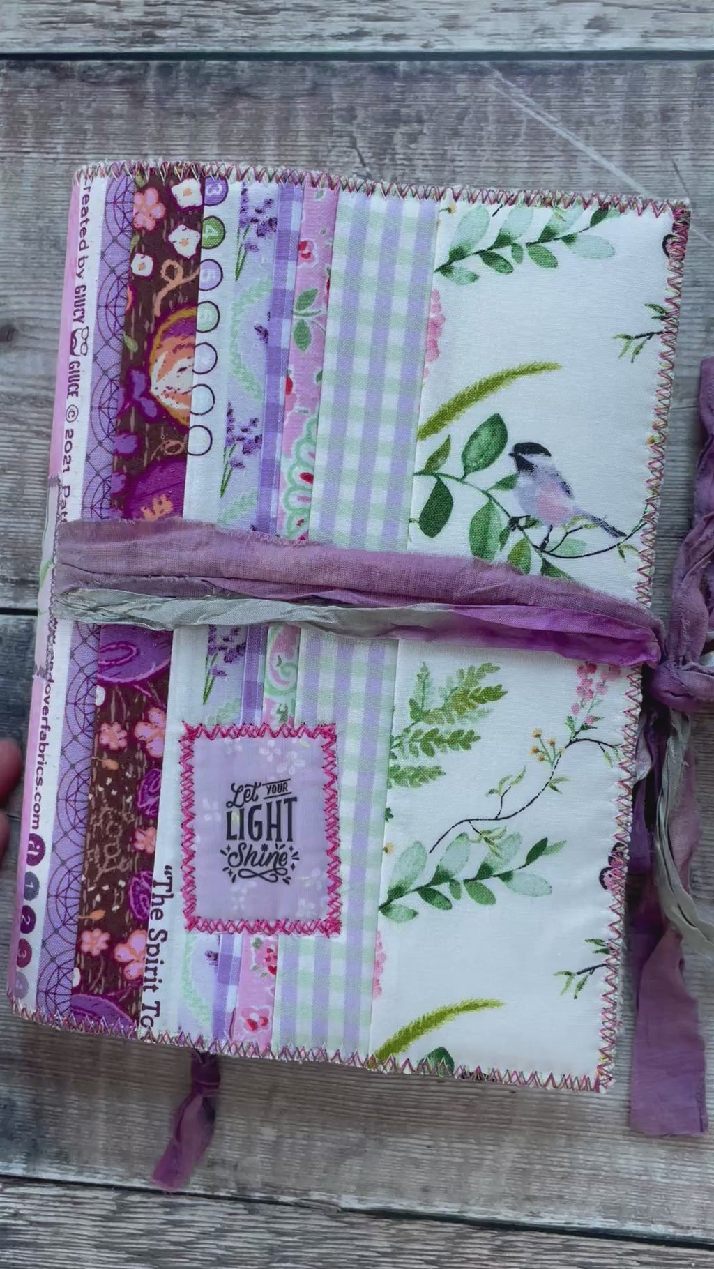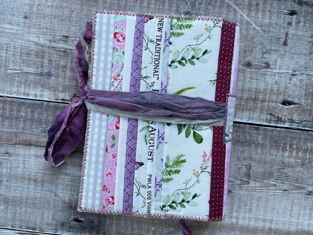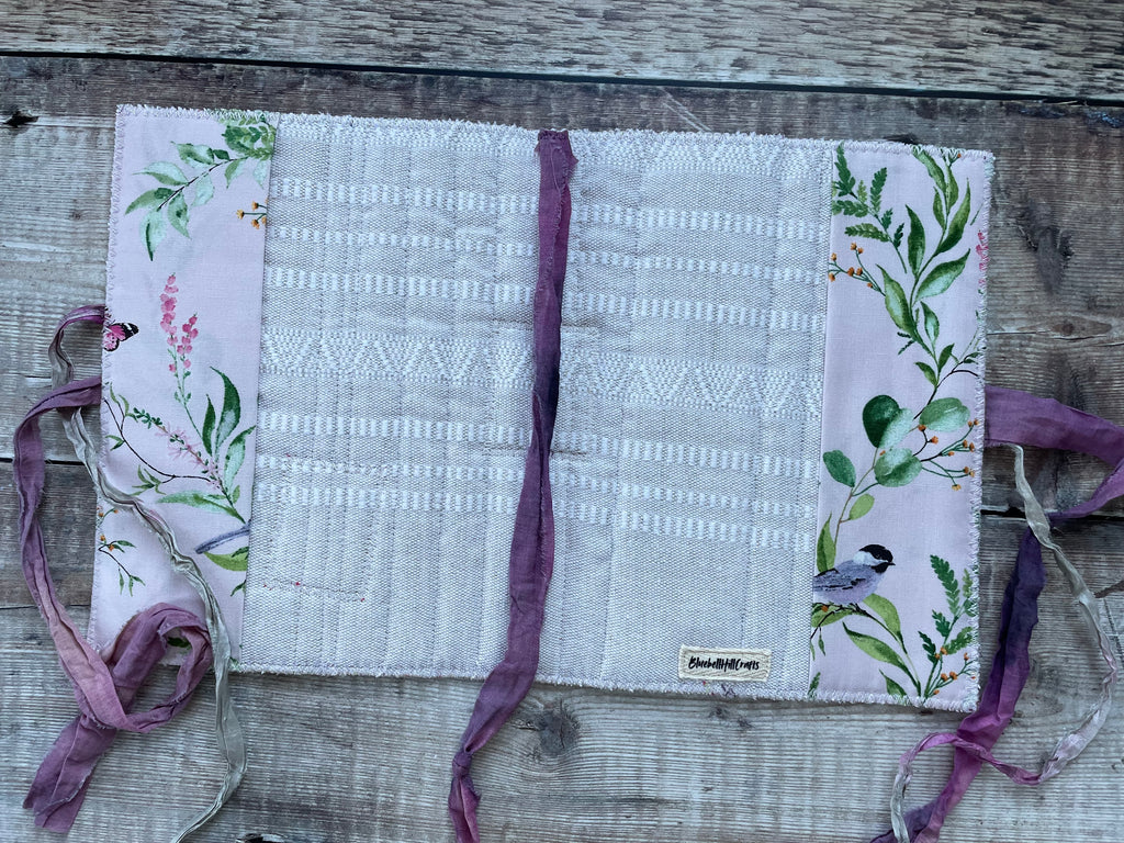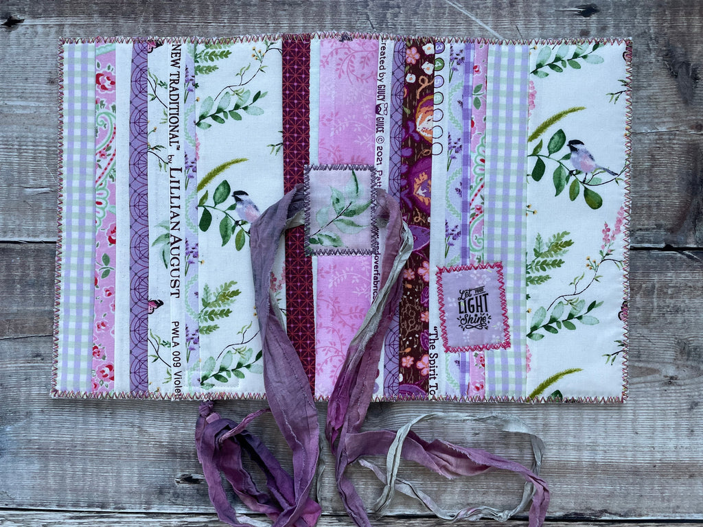 This quilted book cover features a medley of different fabrics including watercolour style birds & leaves from the 'New Traditional' collection by Lillian August (for FreeSpirit Fabrics) as well as some selvage edges for added texture.
