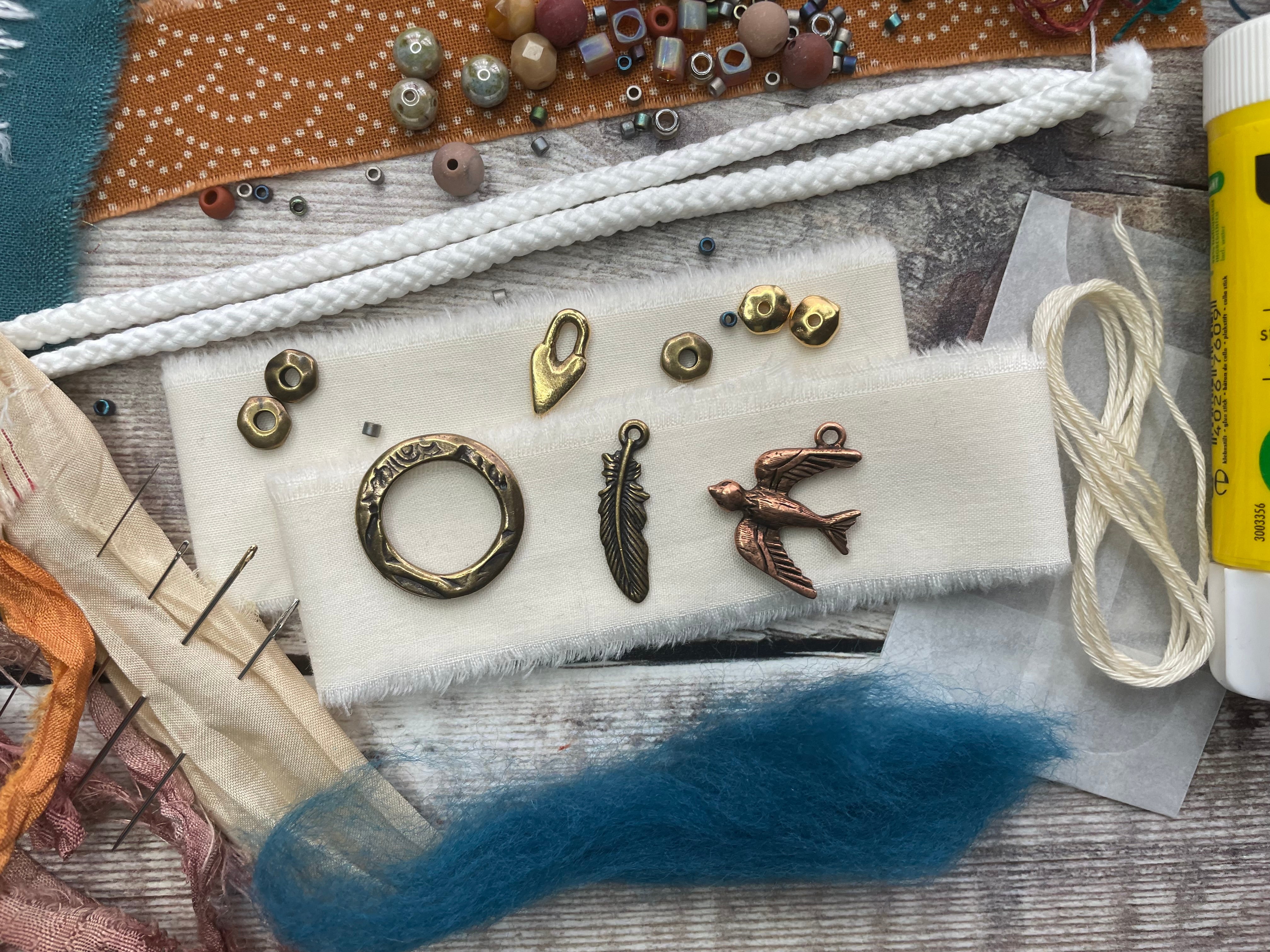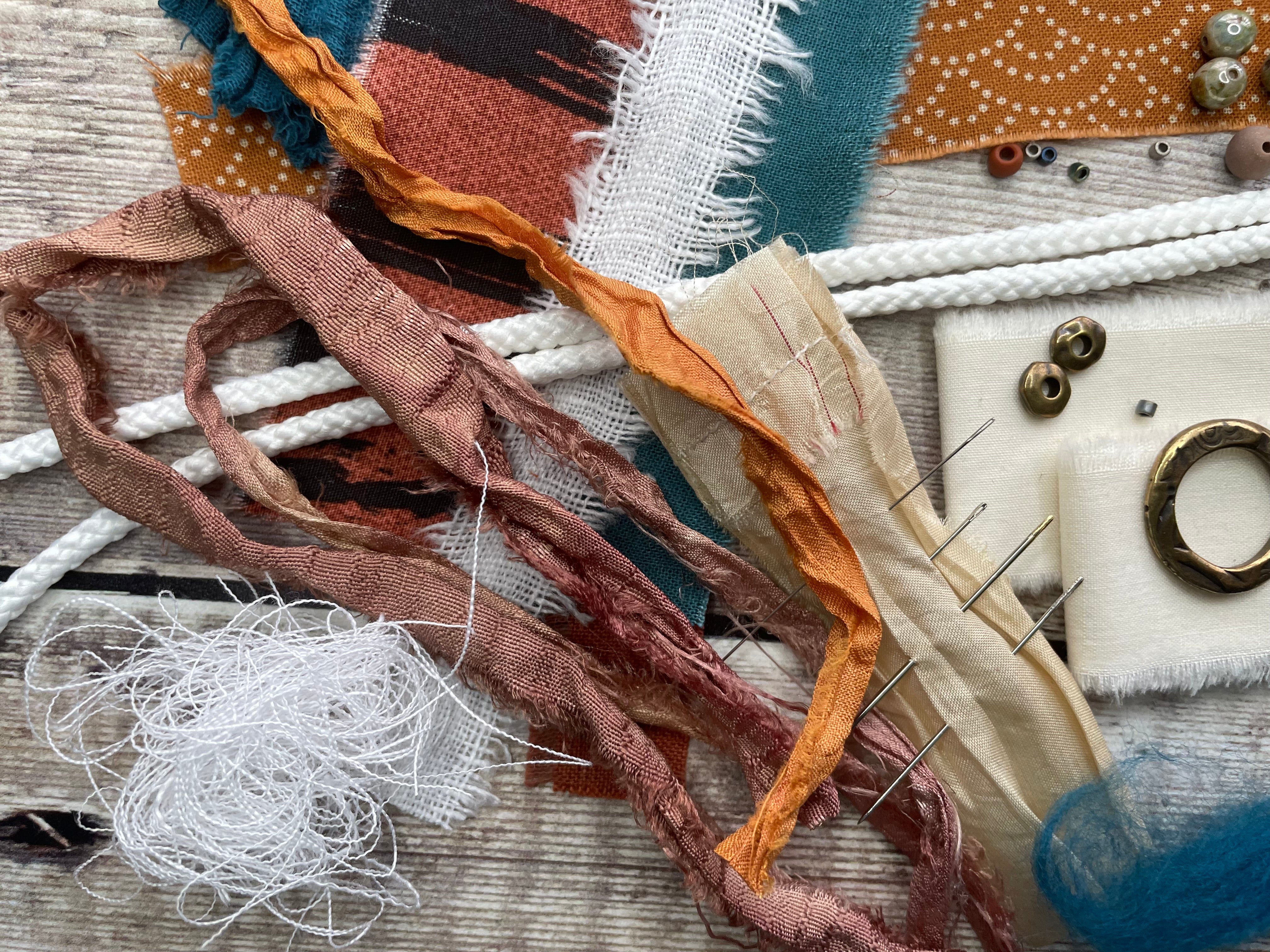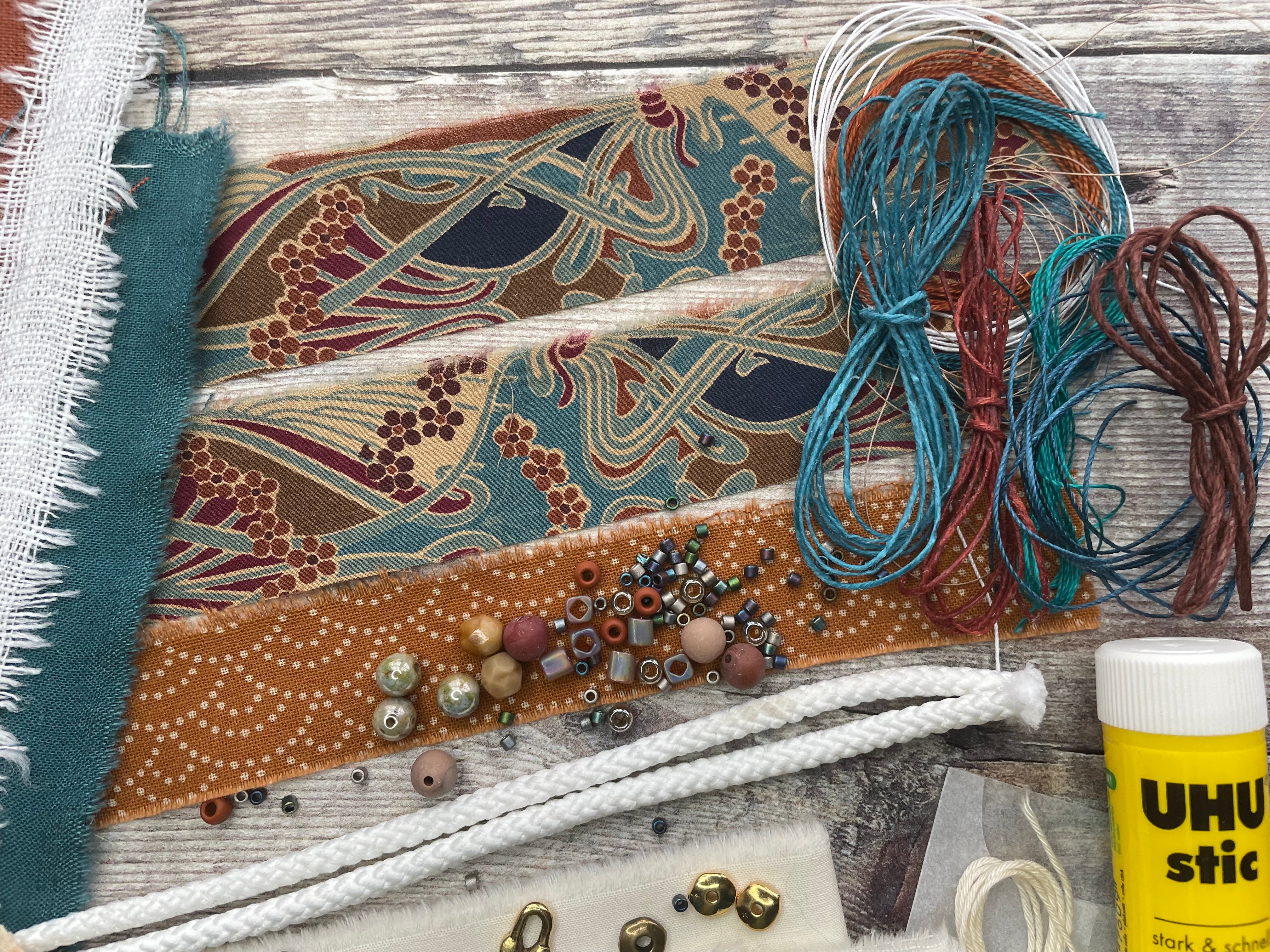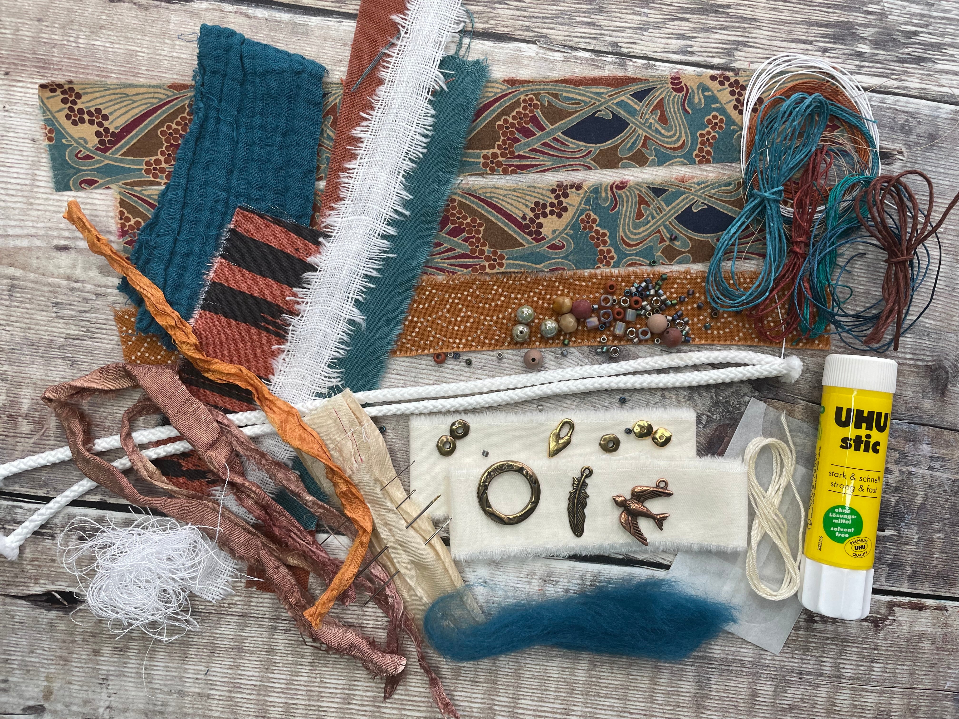 - a selection of different fabrics & threads for you to get creative with - this will differ from kit to kit, for example: cotton, linen, Irish waxed linen cord, hemp cord, embroidery threads, sari silk ribbon pieces, lace, double gauze..